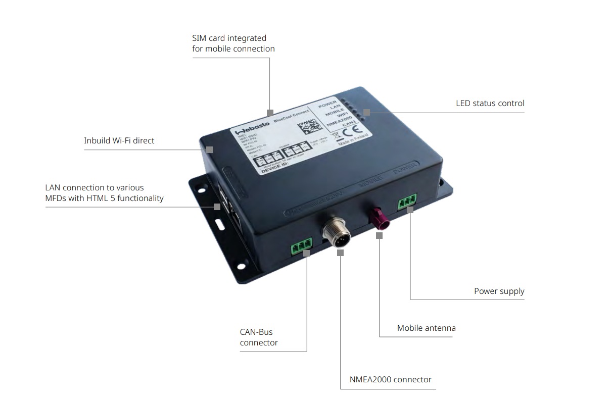 The Webasto BlueCool Connect is a smart connectivity hub for full remote control and monitoring of your BlueCool air-conditioning system. Whether onboard or ashore, its integrated SIM (EU/USA/Canada) and support for Wi-Fi, Ethernet, and NMEA2000 allow seamless remote access to settings, diagnostics, and real-time monitoring.