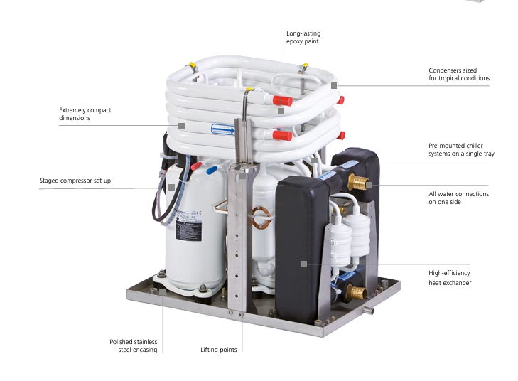 • Reliable operation with copper-nickel heat exchangers, optional soft start, and dedicated cold/seawater pumps